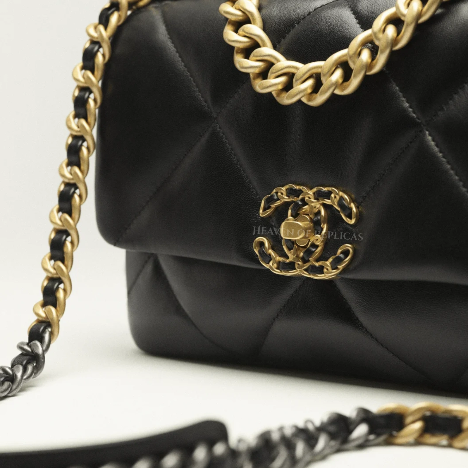 The CHANEL 19 replica handbag features a stylish and modern design inspired by the iconic fashion piece. Crafted from shiny lambskin leather, this premium replica bag is enhanced with elegant mixed-tone hardware including gold-tone, silver-tone and ruthenium-finish metal details.