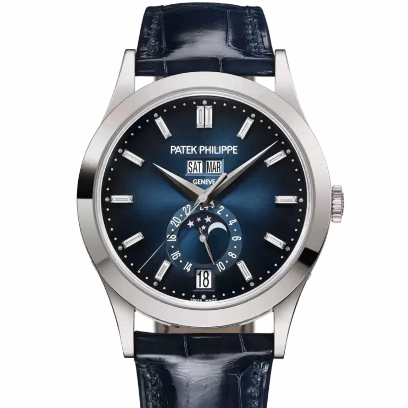 Patek Philippe has reinterpreted its famous self-winding Annual Calendar Reference 5396 (with double day/month aperture at 12 o’clock and date aperture at 6 o’clock) in a white gold version. The blue sunburst dial with black-gradient rim is discreetly enhanced by the sparkle of 12 baguette-cut diamond hour-markers – an elegant contrast highlighting the extremely understated, legible design.