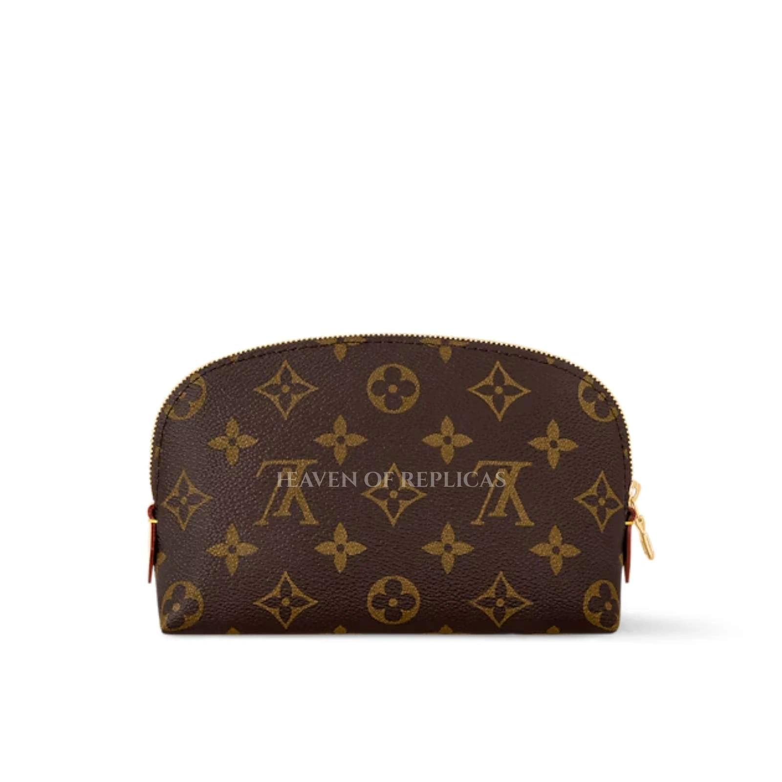 This compact cosmetic pouch in Monogram canvas slips easily into a handbag or suitcase. Its round shape and flat base facilitates access to small products.