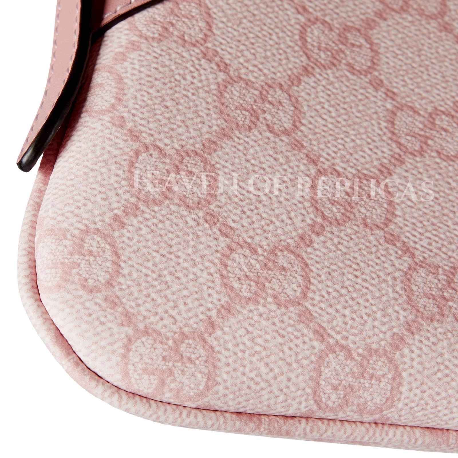 The GG Emblem Small Shoulder Bag Replica offers a refined and compact design inspired by classic luxury fashion. This designer-inspired knockoff GG Emblem bag is crafted from light pink GG monogram coated fabric, complemented by matching leather trim for a soft and elegant look.