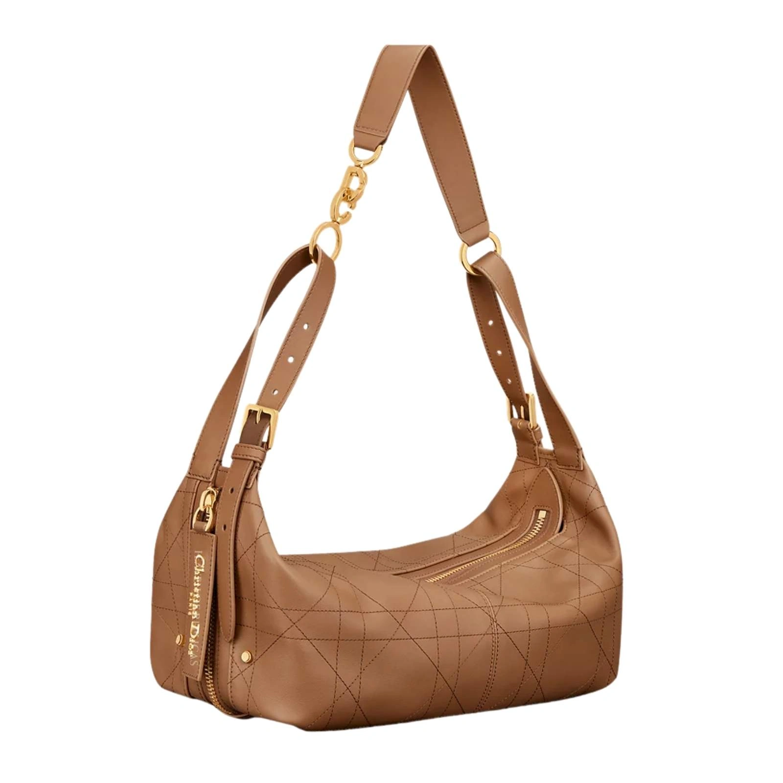The D-Journey bag offers a new take on the hobo silhouette with a modern supple design. The style is crafted in camel vintage smooth calfskin with Flat Macrocannage topstitching in an interpretation of the House’s iconic motif. The main compartment is completed by a zip pocket, while two decorative side pockets showcase a large leather pull with the Christian Dior Paris signature. Featuring adjustable leather top handles and a leather strap, the medium D-Journey bag can be carried by hand, worn over the shoulder or crossbody as a daily companion.