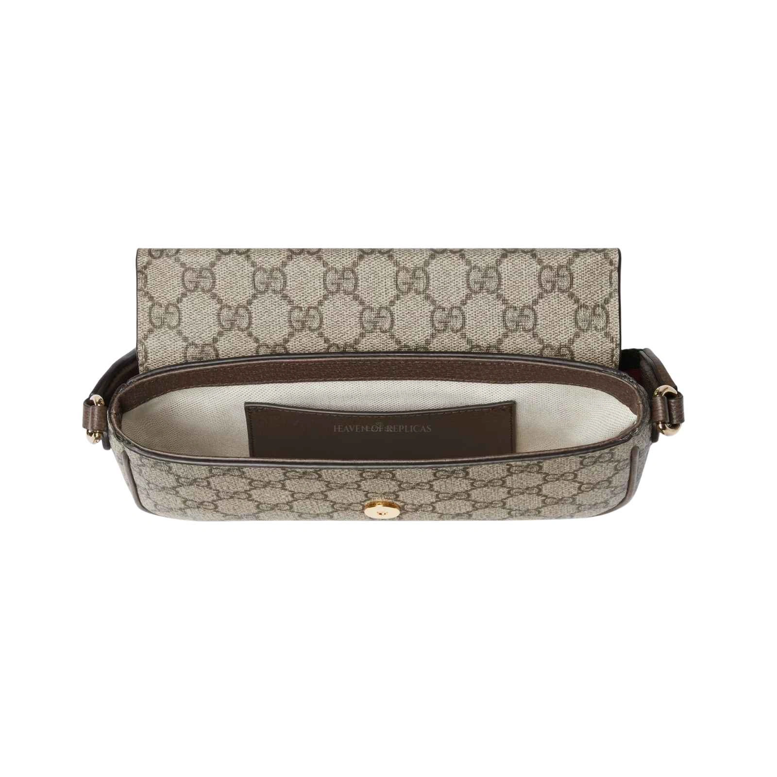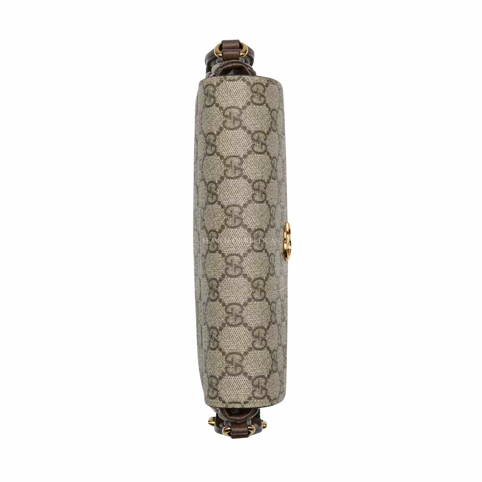 The world of Ophidia continues to evolve, incorporating new shapes and materials each season. Crafted from beige and ebony GG Supreme canvas, this pochette is further enriched by the Double G hardware and a Web shoulder strap.