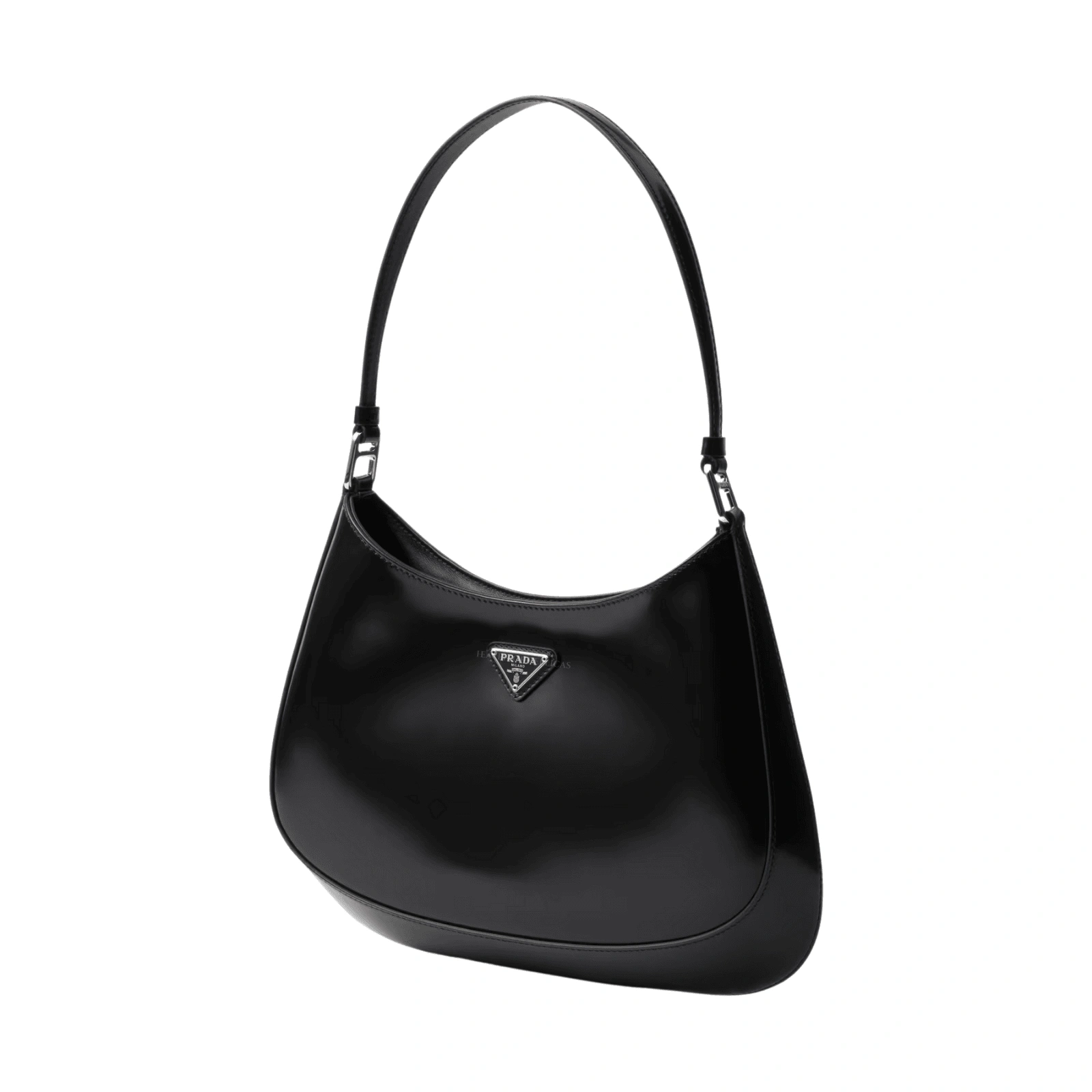 The Prada Cleo bag with sophisticated allure reinterprets an iconic design of the brand from the 1990’s. Sleek curved lines emphasized by the particular construction rounded on the bottom and sides give this hobo bag a soft, light look. Brushed leather, a modern and versatile material that is distinctive in Prada collections, is ideal for creating always new combinations and contrasts. The enamel triangle logo decorates the silhouette.